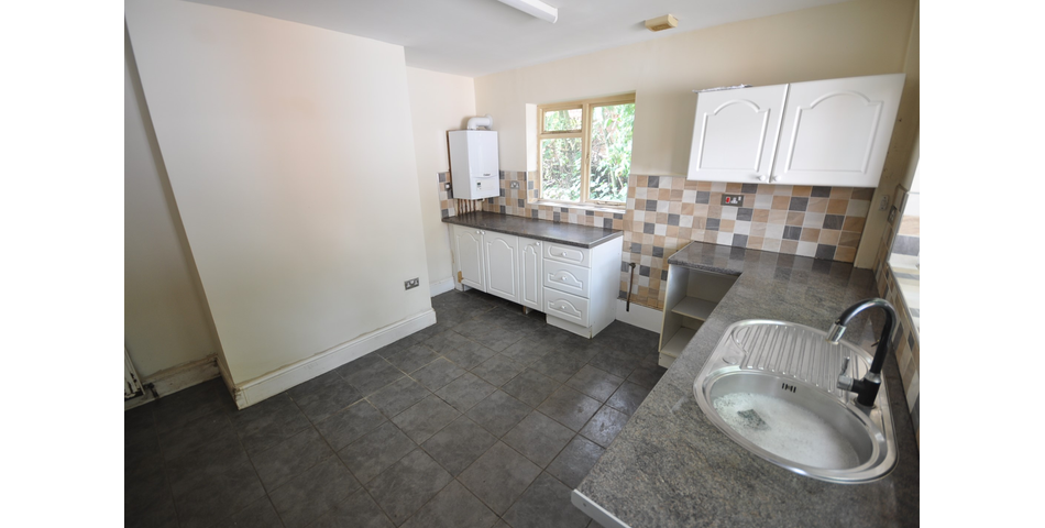 Rear and side facing single glazed windows and rear timber entrance door. Fitted with a range of white wall and base units with granite effect worksurfaces incorporating a stainless steel sink and drainer with splashback tiling. Space and plumbing for washing machine and cooker. Tiled floor. Radiator. Wall mounted gas combi central heating boiler. Useful walk-in pantry.