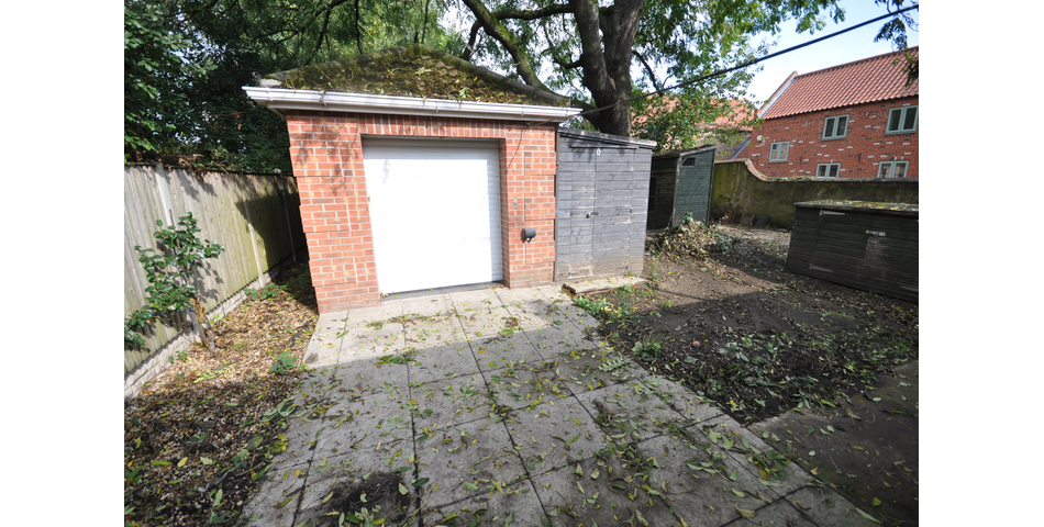 Brick construction with pitched and tiled roof. Front roller shutter access door. Adjoining timber shed.