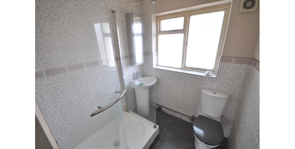 Rear facing single glazed window. Fitted with a tiled shower cubicle with electric shower, pedestal wash hand basin and w.c. Tiled walls and floor. Chrome towel radiator.