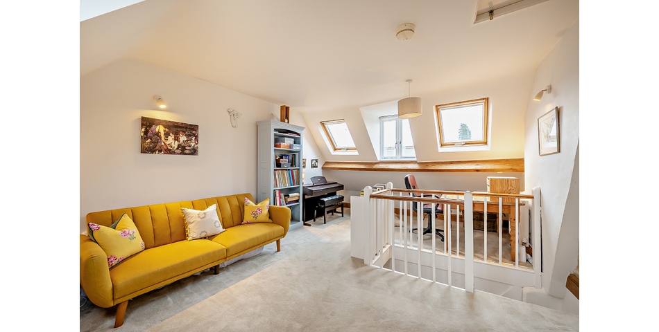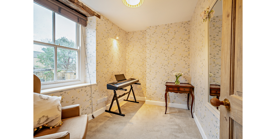 On the first floor, you will find two comfortable bedrooms, including a generous principal room complete with its own fireplace, and a separate WC. The top floor presents a full-width bedroom or study, beautifully enhanced by exposed masonry and original wooden beams, creating a versatile space that could serve as a home office, guest room, or creative retreat.