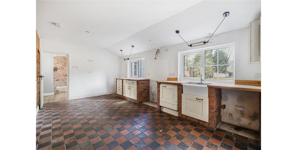 • A breakfast kitchen with fitted cabinetry, quarry tiled floor and exposed brickwork, with a door leading to the rear garden