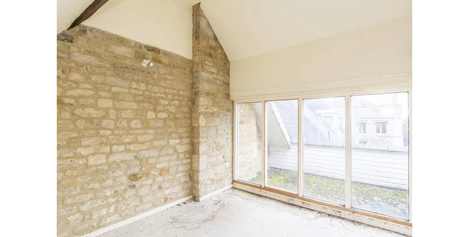 Bedroom Three - 4.47m x 3.40m (14'8 x 11'2) - Picture windows overlooking roof terrace. 'Velux' window to rear aspect. Exposed stone feature wall. Exposed beams to ceiling. Radiator.