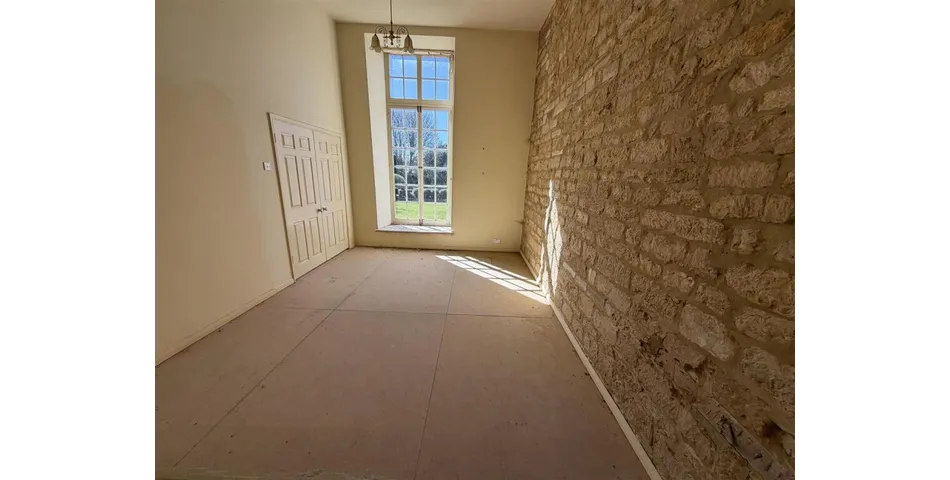 Drawing Room - 8.89m x 4.75m (29'2 x 15'7) - Magnificent room with 16' high ceilings and high double doors opening out to the landscaped formal gardens. Two large wooden framed picture windows. Opening through to: Kitchen/diner. Open fireplace with stone surround. Wooden flooring. Two radiators.