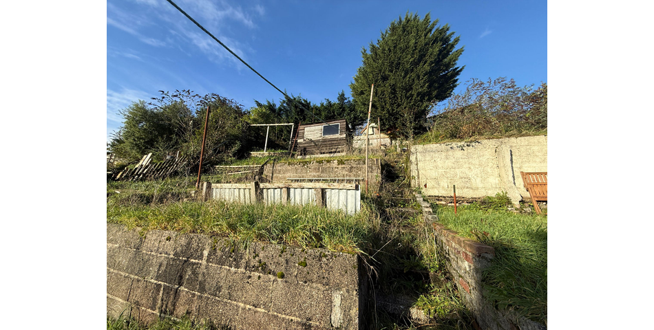 Tiered garden to the rear with timber shed.